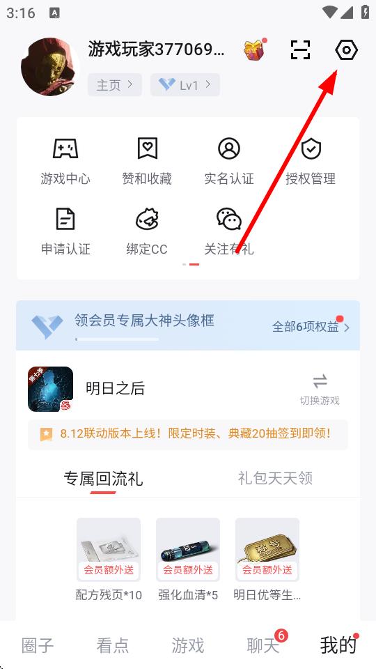 2、在個人頁面右上角,點擊六邊形設(shè)置圖標(biāo),進(jìn)入設(shè)置界面。
