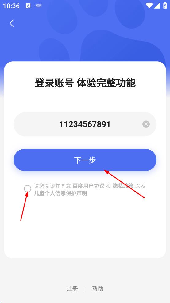 4、勾選閱讀并同意協(xié)議,然后點(diǎn)擊“下一步”按鈕,按后續(xù)提示完成百度賬號(hào)登錄操作。
