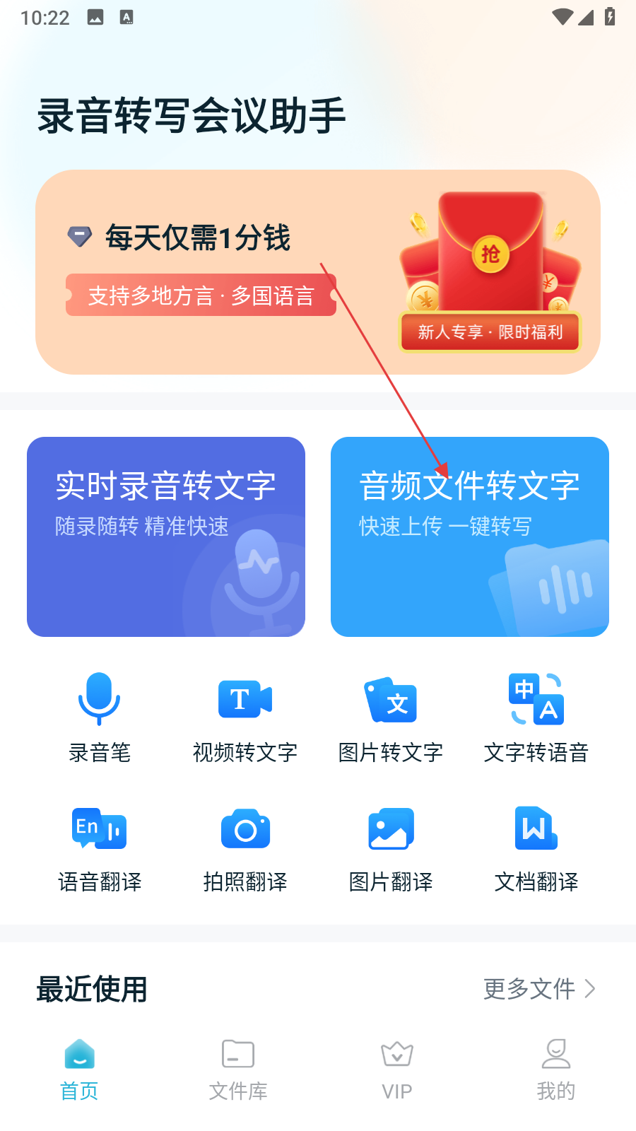 1、打開錄音轉寫會議助手,點擊音頻文件轉文字選項,進入導入音頻頁面。