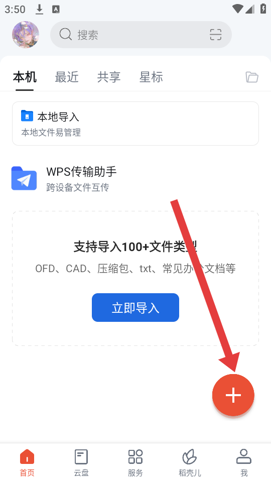 1、打開WPS Office的app軟件,在首頁右下角找到紅色+號按鈕,點(diǎn)擊該按鈕彈出新建功能菜單。