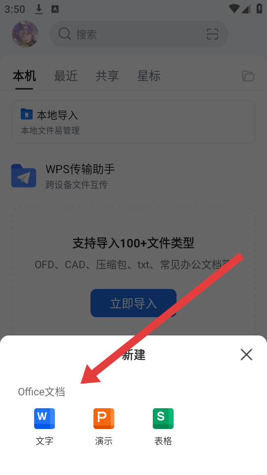 2、在彈出的新建功能菜單中,需要點(diǎn)擊Office文檔板塊下的文字選項(xiàng),進(jìn)入新建文檔的頁面。