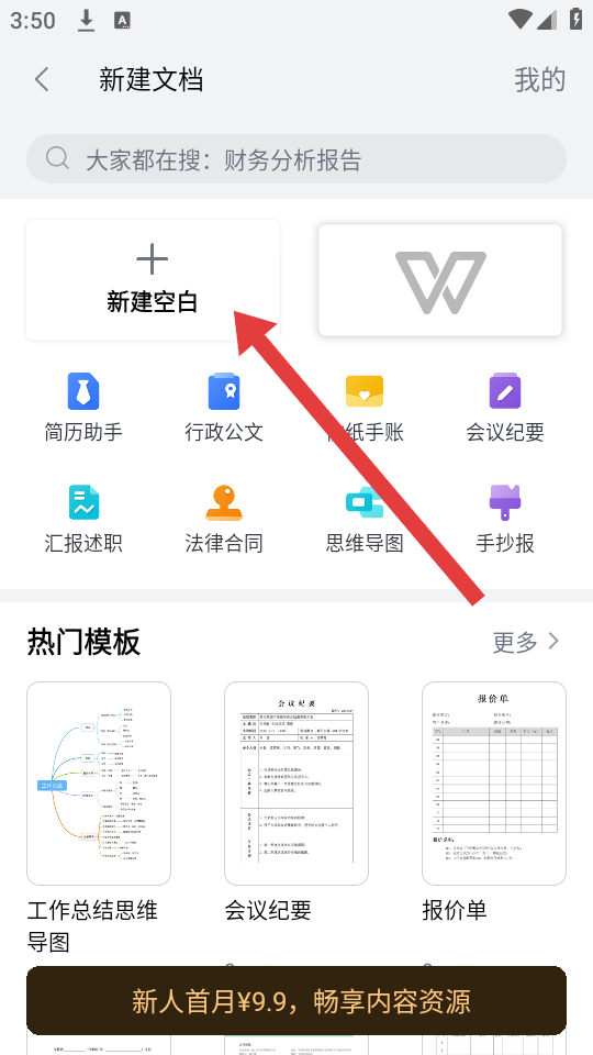 3、在新建文檔的頁面中,需要點(diǎn)擊新建空白的選項(xiàng),這樣我們就可以創(chuàng)建一個(gè)新的Word文檔。