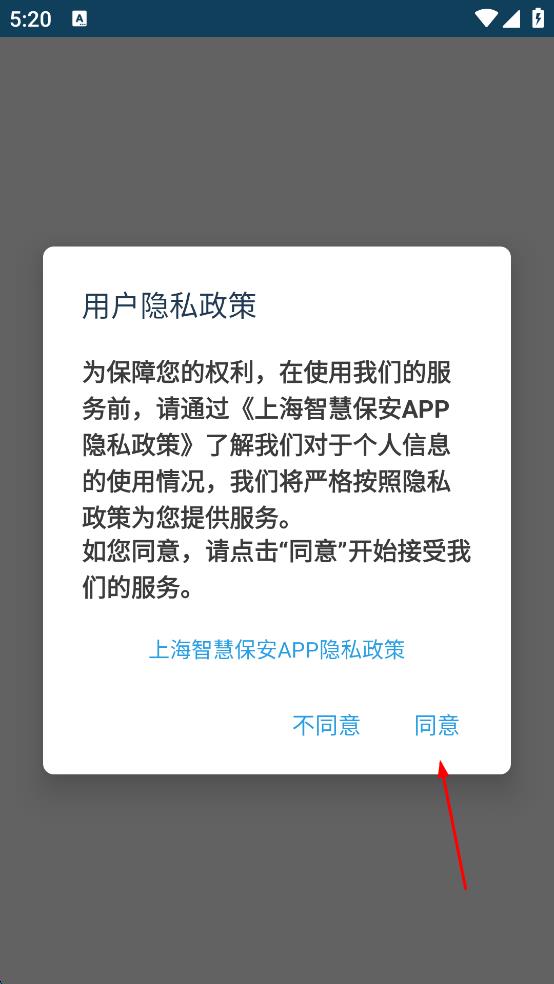 1、打開(kāi)上海智慧保安App,彈出“用戶(hù)隱私政策”提示框,仔細(xì)閱讀后點(diǎn)擊“同意”,進(jìn)入到應(yīng)用主界面。