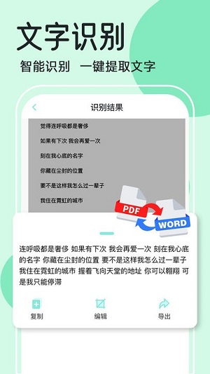 4、文檔掃描:文檔拍照后,可快速轉(zhuǎn)換導(dǎo)出為pdf文檔,發(fā)送至微信、QQ等應(yīng)用。