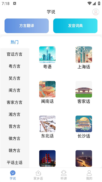 方言通是一款由梅州市拓思信息科技有限公司開發(fā)的方言學(xué)習(xí)軟件,它收錄了全國數(shù)十種主要方言,如粵語、閩南語、吳語、四川話等的常用詞句和發(fā)音,均由地道當(dāng)?shù)厝虽浿?,軟件具備?shí)時(shí)語音翻譯功能,能將朋友的話直接翻譯成當(dāng)?shù)胤窖?,幫助用戶輕松應(yīng)對交流難題。