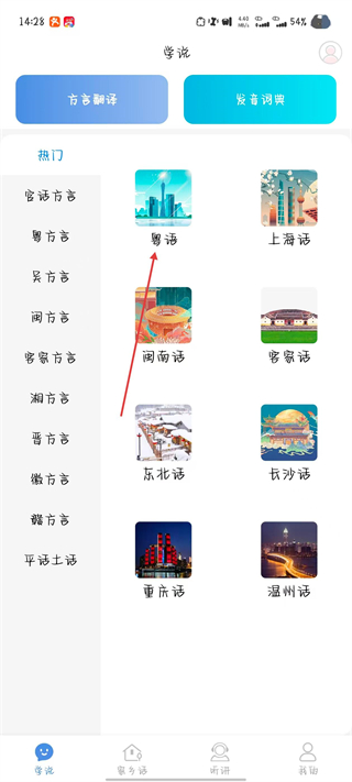 1、打開方言通app,在學(xué)說頁面選擇要學(xué)習(xí)的方言。