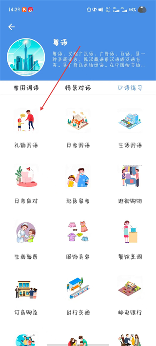 2、進(jìn)入方言學(xué)習(xí)頁面后,選擇口語練習(xí)分類下的具體內(nèi)容。