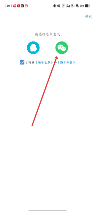 3、在登錄方式選擇頁面點(diǎn)擊微信圖標(biāo),勾選條款和政策選項(xiàng)。