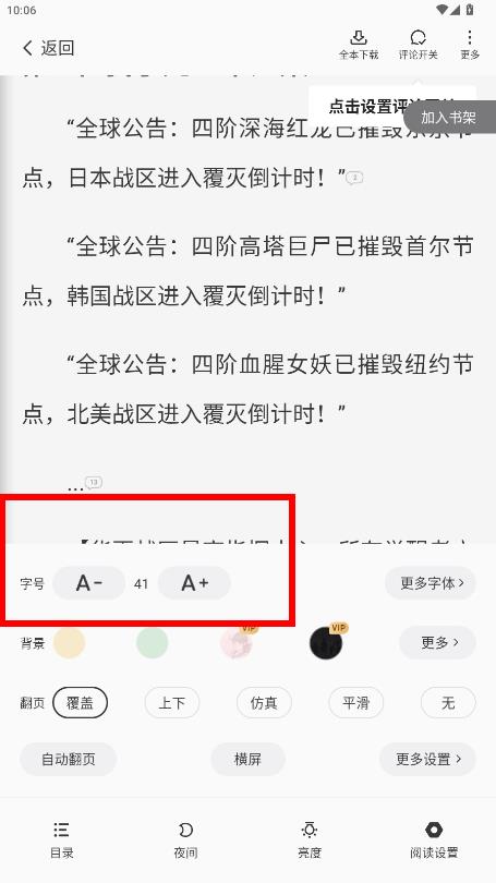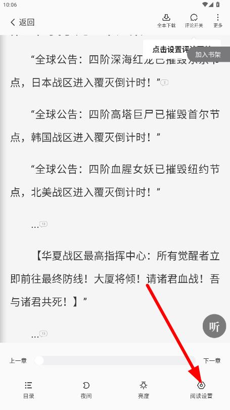 3、在閱讀界面中,點(diǎn)擊底部導(dǎo)航欄中的閱讀設(shè)置選項。