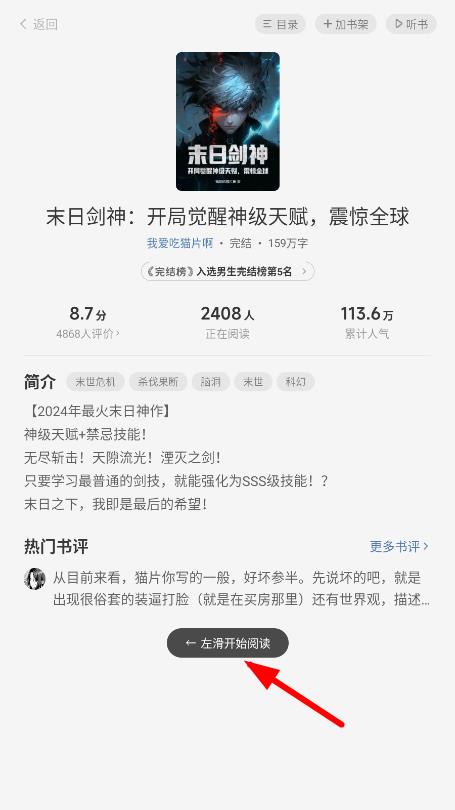 2、點(diǎn)擊進(jìn)入小說詳情頁,左滑開始閱讀小說內(nèi)容。
