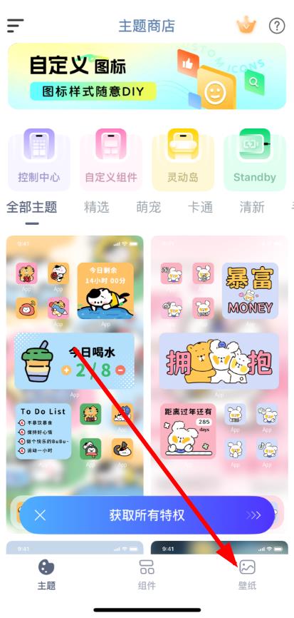 1、打開(kāi)免費(fèi)主題壁紙桌面應(yīng)用進(jìn)入主題商店,點(diǎn)擊底部壁紙選項(xiàng)進(jìn)入壁紙界面。