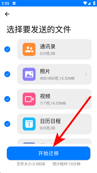 2、選擇要發(fā)送的文件如通訊錄、照片等,點(diǎn)擊開始遷移。
