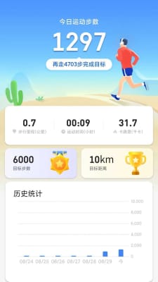 3、時刻精準(zhǔn)記錄走路步數(shù),輕松查看里程、時間、卡路等數(shù)據(jù)。