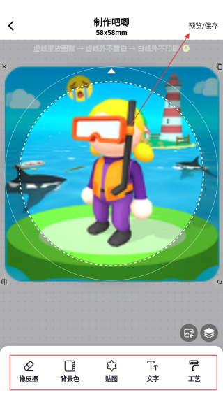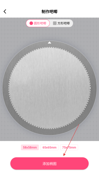 2、在制作吧唧頁面,選擇吧唧形狀與尺寸,接著點(diǎn)擊添加柄圖按鈕。