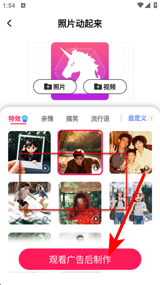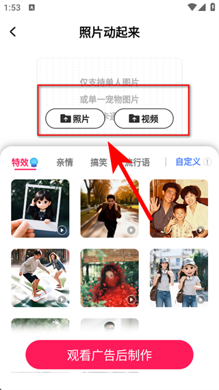 3、選擇照片或視頻導(dǎo)入素材,然后選擇喜歡的特效類型如特效、親情、搞笑等。