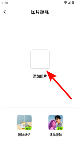 3、在圖片擦除頁面,點(diǎn)擊添加照片按鈕,添加你想要去除多余人物的圖片。
