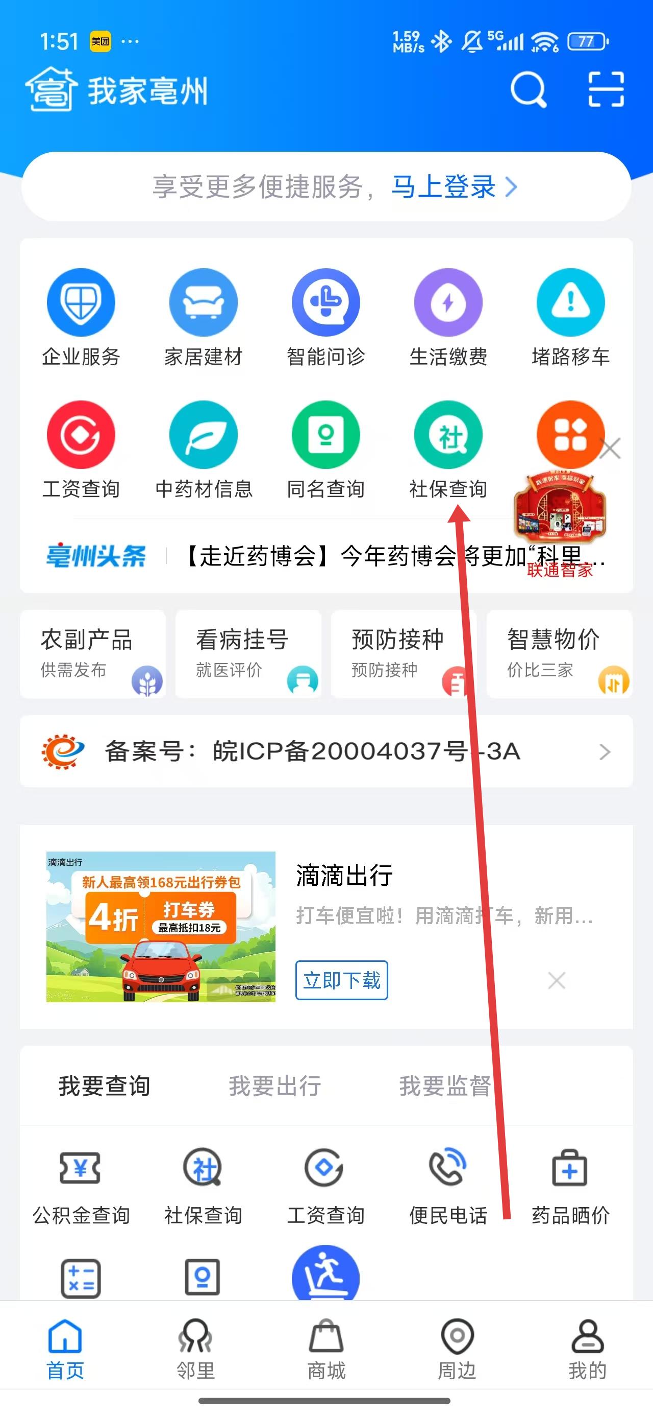 1、在進(jìn)入到我家亳州首頁(yè)中,點(diǎn)擊首頁(yè)中的社保查詢選項(xiàng),進(jìn)入查詢社保。