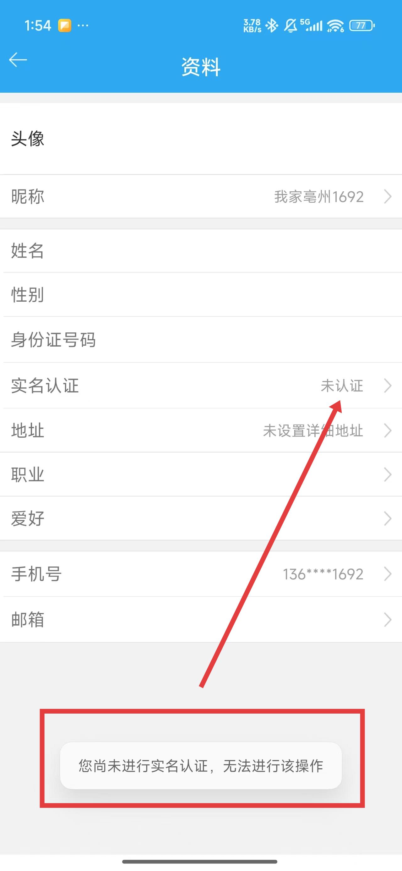 2、在跳轉(zhuǎn)到資料頁(yè)面中,顯示還未實(shí)名認(rèn)證無(wú)法操作,點(diǎn)擊實(shí)名認(rèn)證選項(xiàng)進(jìn)入實(shí)名認(rèn)證。