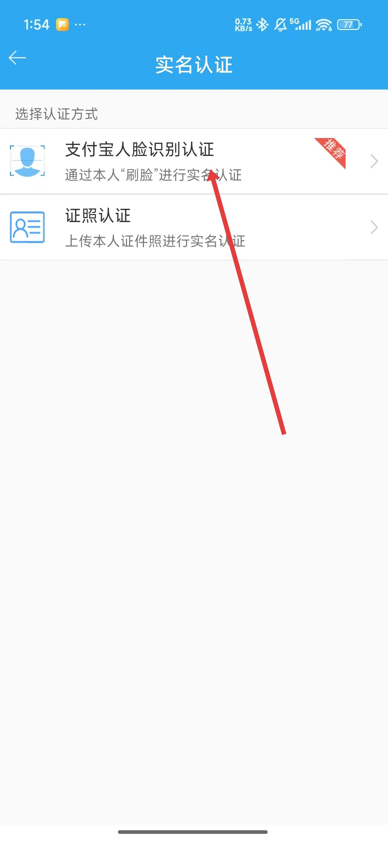 3、在進(jìn)入帶實(shí)名認(rèn)證頁(yè)面中,可以點(diǎn)擊選擇支付寶人臉識(shí)別認(rèn)證的方式進(jìn)行實(shí)名認(rèn)證。