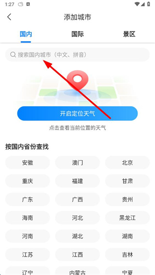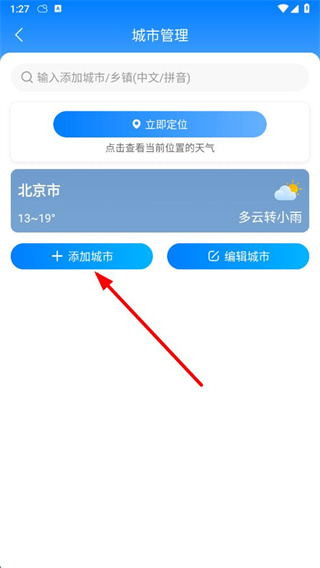 3、在添加城市頁面的搜索欄中,輸入要添加的城市名稱。