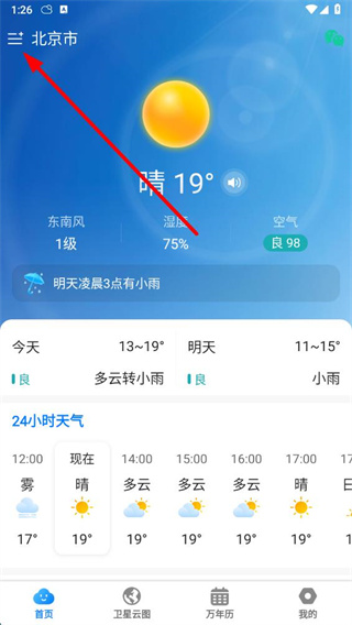 1、打開當(dāng)準(zhǔn)天氣app,點(diǎn)擊左上角的城市選擇圖標(biāo),進(jìn)入城市管理頁面。