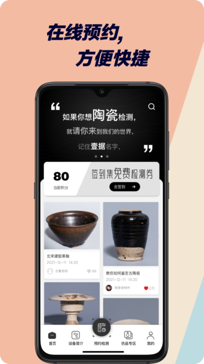 壹據(jù)技術(shù)檢測app是一款可以幫助用戶對瓷器進(jìn)行檢測的軟件,提供的功能十分的豐富多樣,用戶能夠在平臺進(jìn)行在線預(yù)約瓷器檢測,快速的得出檢測報告,支持用戶將報告下載下來,提供的服務(wù)功能都是大家需要的,大家還能在平臺每天簽到打卡,獲得更多的福利。