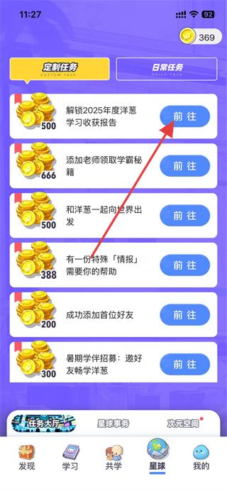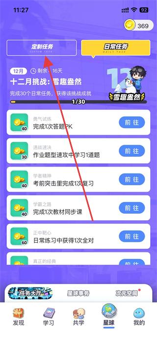 2、在星球頁面中,選擇并點(diǎn)擊上方的定制任務(wù)板塊。