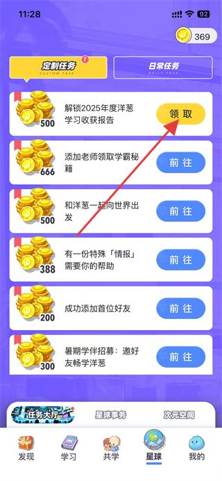 4、任務(wù)完成后返回,點(diǎn)擊領(lǐng)取按鈕即可獲得洋蔥幣。
