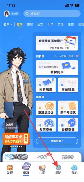 1、打開洋蔥學(xué)園APP,點(diǎn)擊底部導(dǎo)航欄的星球選項(xiàng)。