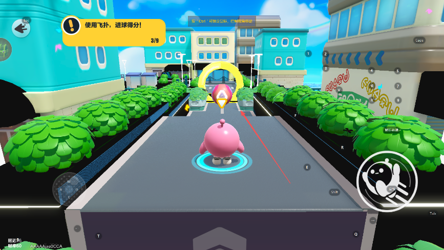 1、進入游戲,看到提示使用飛撲,進球得分,通過操控按鈕控制粉色蛋仔移動,靠近球后,點擊飛撲按鈕進球。