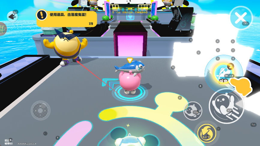 3、當出現(xiàn)使用道具,擊落魔鬼蛋提示,拾取如咸魚等道具,點擊道具按鈕,向黃色魔鬼蛋發(fā)射道具,完成任務(wù)要求。