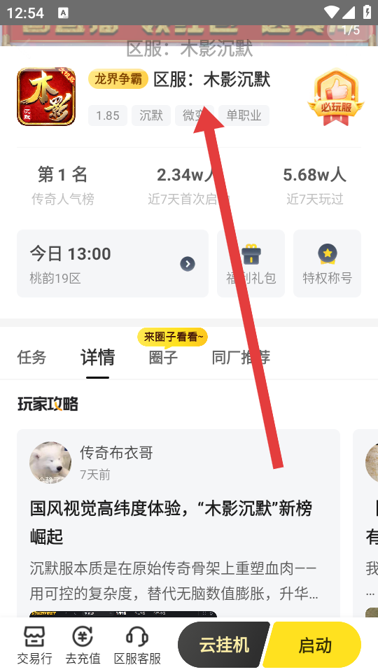 3、在搜索到的游戲詳情頁(yè)可以查看區(qū)服信息、人氣數(shù)據(jù)及攻略,點(diǎn)擊底部啟動(dòng)按鈕即可進(jìn)入游戲。