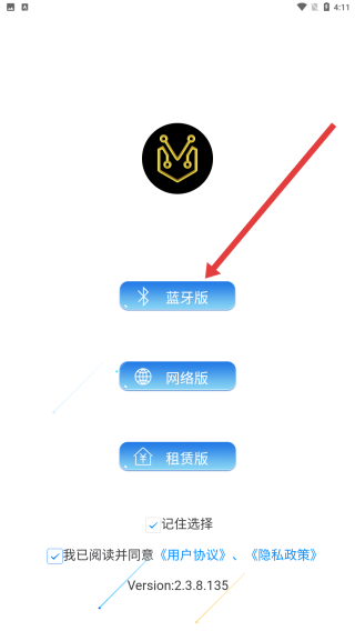1、在版本選擇頁(yè)面勾選用戶協(xié)議與隱私政策,點(diǎn)擊藍(lán)牙版按鈕,進(jìn)入ANT-BMS的藍(lán)牙連接配置階段。