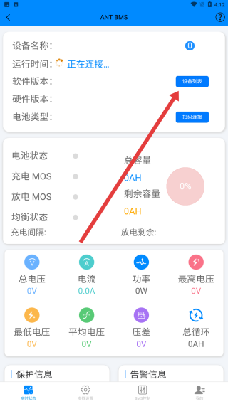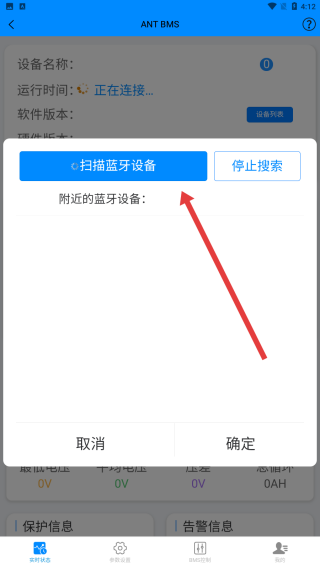 2、進(jìn)入ANT-BMS界面后,點(diǎn)擊右上角設(shè)備列表按鈕,觸發(fā)藍(lán)牙設(shè)備的搜索彈窗顯示。