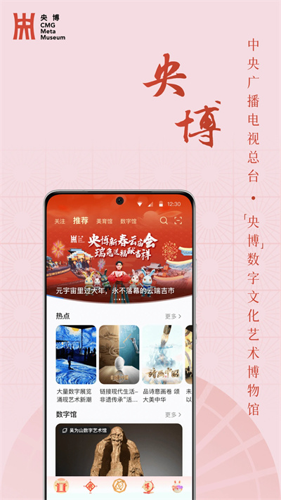 央博,全稱中央廣播電視總臺“央博”數(shù)字文化藝術博物館,定位為國家級數(shù)字文化藝術綜合服務平臺,將以APP為主平臺,以央博元宇宙藝術空間為核心,整合國內(nèi)外博物館資源、書畫藝術資源、美育資源、藝術品交易資源,聚創(chuàng)新之力、展藝術之美、育未來之才,發(fā)展數(shù)字書畫藝術消費新場景,服務國家文化數(shù)字化戰(zhàn)略,服務美好生活。