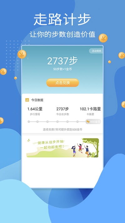 1、步數(shù)換金幣,每天記錄運(yùn)動(dòng)步數(shù),可以換取對應(yīng)的金幣數(shù)額;