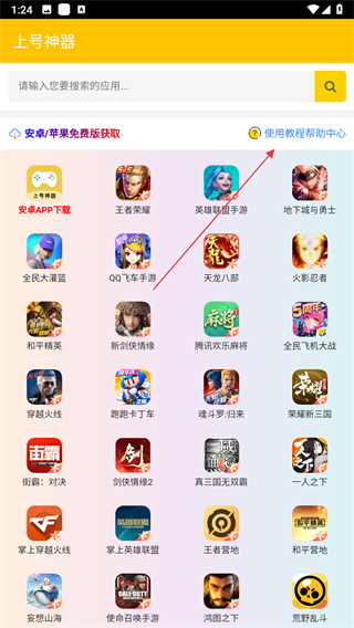 1、打開上號(hào)神器應(yīng)用,點(diǎn)擊界面里的使用教程幫助中心,進(jìn)入掃碼登錄使用教程頁面。