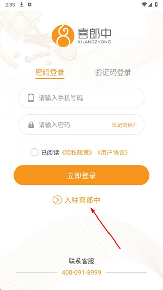 1、打開喜郎中APP,在登錄頁面點擊入駐喜郎中選項。