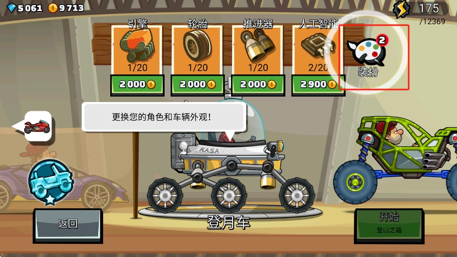 1、進入游戲后需要再這里進入游戲,然后可以看到多種有關(guān)賽車種類選擇還有設(shè)備升級等;
