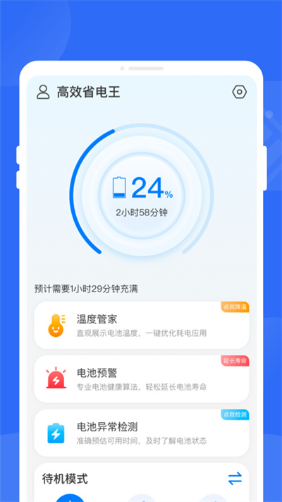 高效省電王是一款實用便捷的電池健康省電管理軟件,能實時跟蹤電量變化,實時掌握手機信息,電池健康檢測、一鍵省電、耗電優(yōu)化,多維度維護電池健康,延長電池壽命。