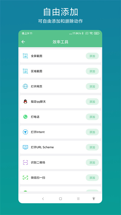 一款手機(jī)快捷操作工具APP,可以快速實(shí)現(xiàn)全屏截圖、區(qū)域截圖、打開(kāi)常用APP掃一掃功能、打開(kāi)常見(jiàn)的收款碼和付款碼、打開(kāi)手機(jī)系統(tǒng)設(shè)置、打開(kāi)常用APP。軟件支持用戶自由配置常用指令、配置指令圖片、指令名稱,同時(shí),可以發(fā)送到桌面,點(diǎn)擊桌面圖標(biāo)即可執(zhí)行。