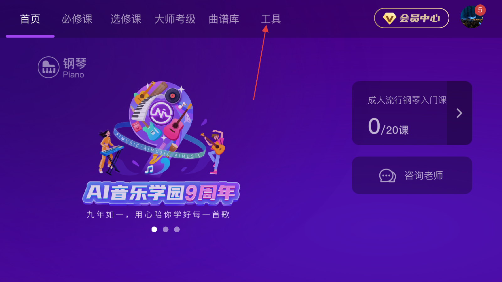 1、打開AI音樂學(xué)園APP,點(diǎn)擊頁面頂部功能欄里的工具選項(xiàng),進(jìn)入工具界面。