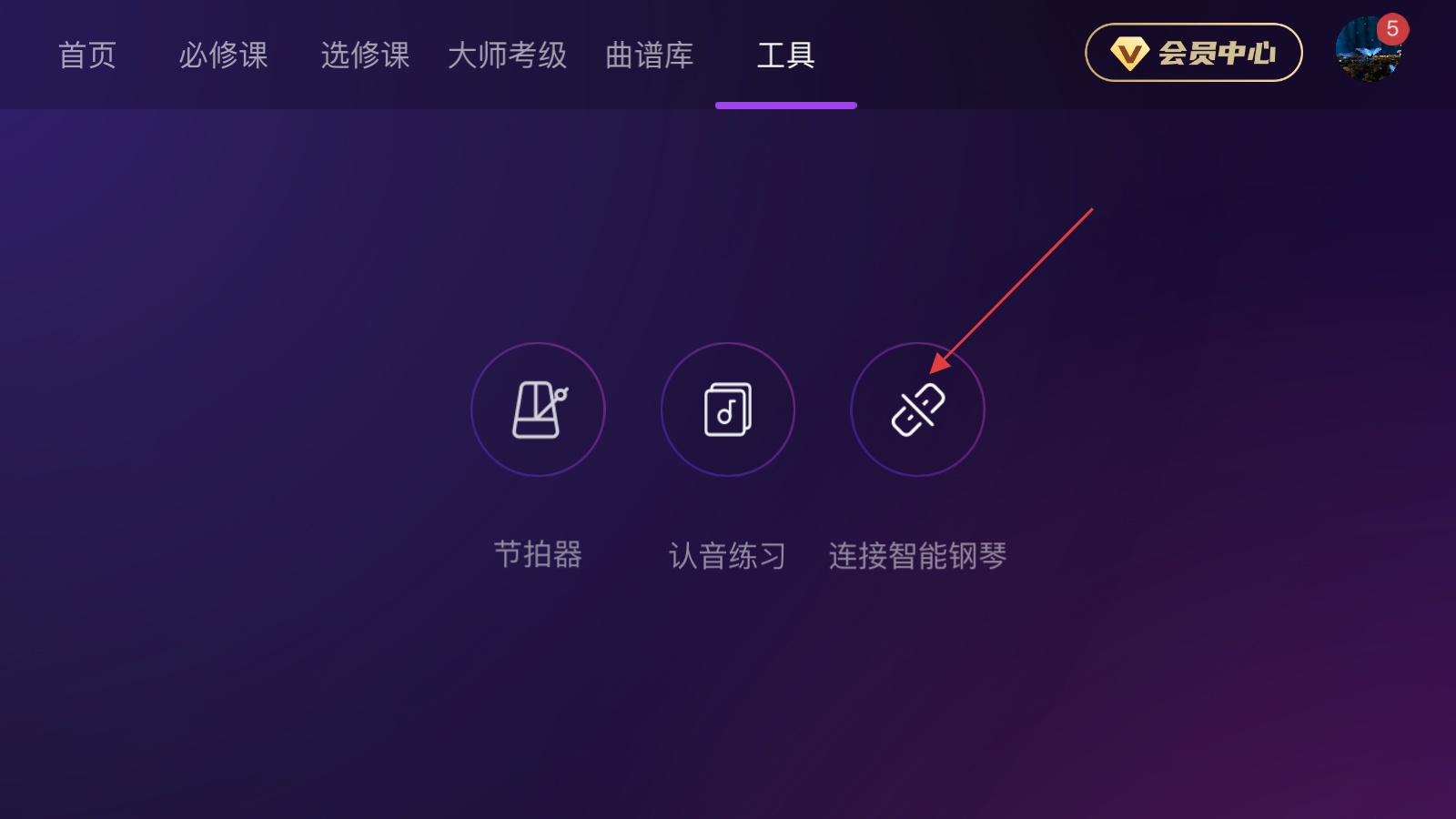 2、在工具界面中,找到連接智能鋼琴選項(xiàng)并點(diǎn)擊,進(jìn)入連接智能鋼琴的選擇界面。