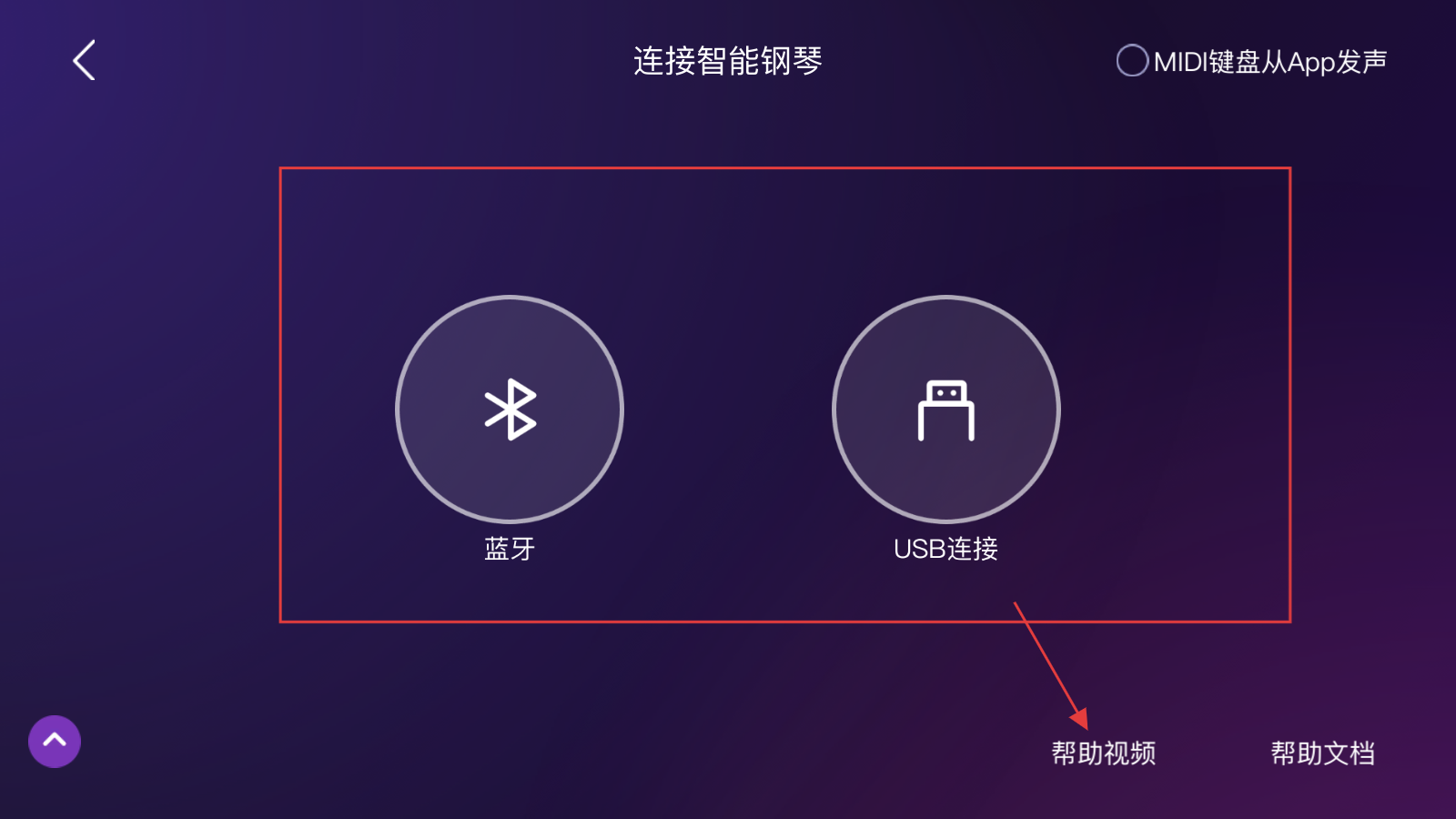 3、進(jìn)入連接智能鋼琴界面后,能看到藍(lán)牙和USB連接兩種連接方式,若想查看連接教程,點(diǎn)擊幫助視頻選項(xiàng)。