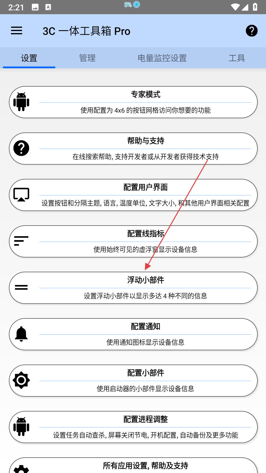 2、在設(shè)置界面中,點(diǎn)擊浮動(dòng)小部件選項(xiàng),進(jìn)入浮動(dòng)小部件設(shè)置頁(yè)面。