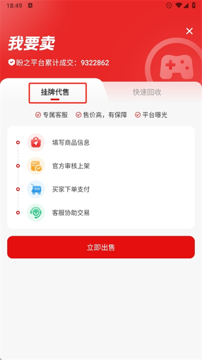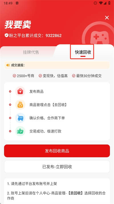 3、而快速回收是將自己的賬號可以直接進(jìn)行回收,發(fā)布后會有想要回收的用戶前來聯(lián)系自己進(jìn)行快速回收;