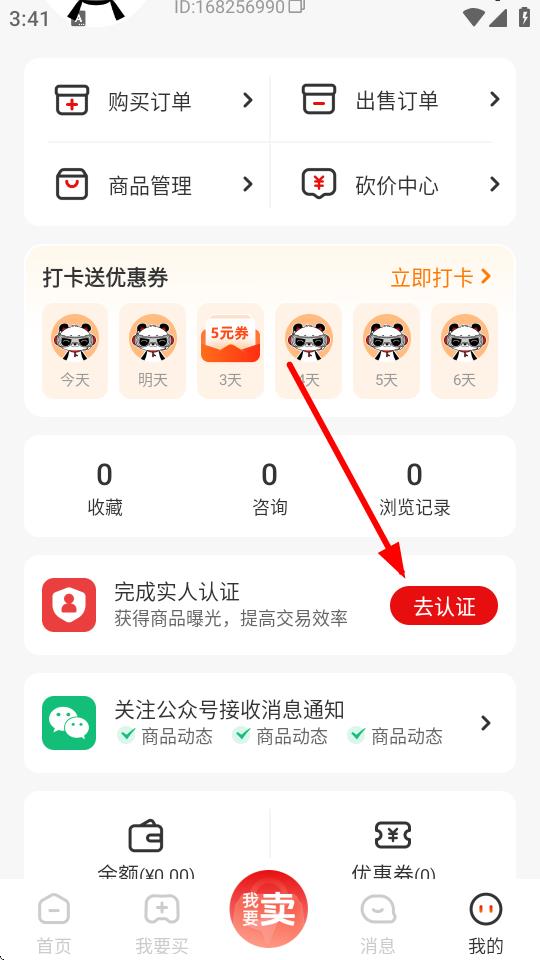 2、在我的頁面中,找到完成實人認(rèn)證板塊,點擊去認(rèn)證按鈕。