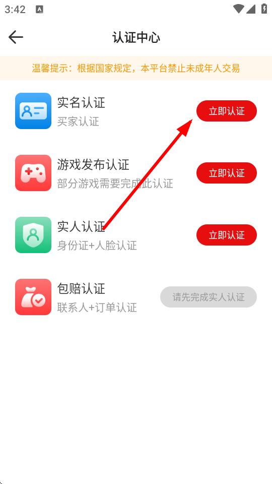 3、進(jìn)入認(rèn)證中心頁面后,點擊實名認(rèn)證右側(cè)的立即認(rèn)證選項。