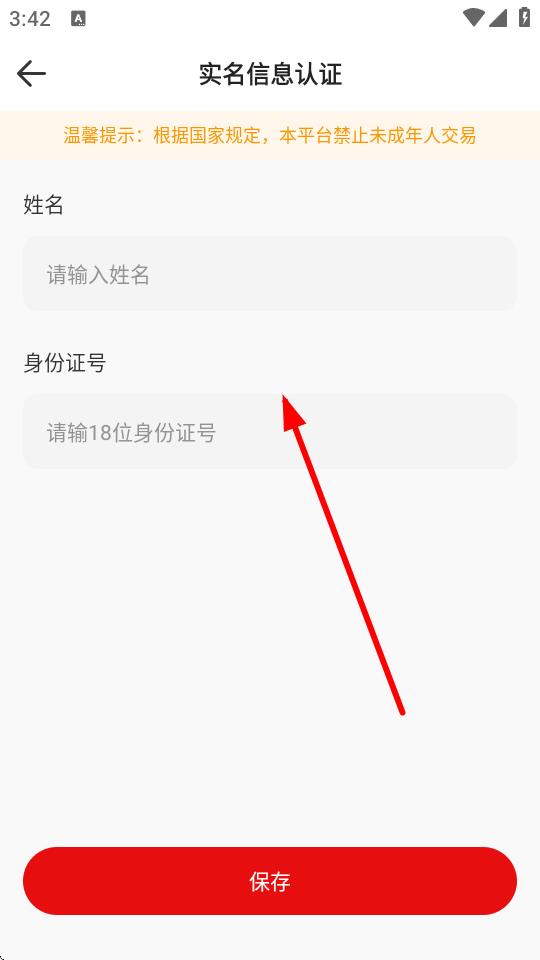 4、在實名信息認(rèn)證頁面,輸入姓名和身份證號,點擊保存完成實名認(rèn)證。