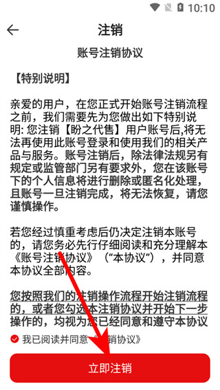 4、在注銷協(xié)議頁面,勾選同意協(xié)議后點擊立即注銷按鈕,即可進(jìn)行賬號注銷操作。